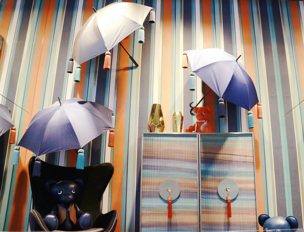條紋壁紙與帶有流蘇的雨傘,眼神迷離的泰迪熊,這個場景展現(xiàn)的是一個有趣的“雨天”。