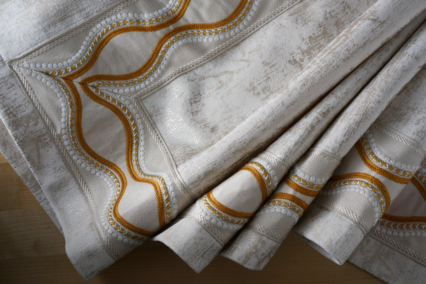 以人棉為主要原料,呈現(xiàn)啞光的、柔軟的感覺(jué),再加上一點(diǎn)點(diǎn)的金線,仿佛在平靜的水面上,波光粼粼的動(dòng)感。